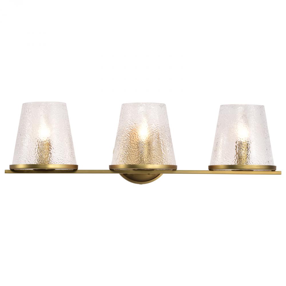 Valentine; 3 Light Vanity; Vintage Brass Finish; Hammered Glass