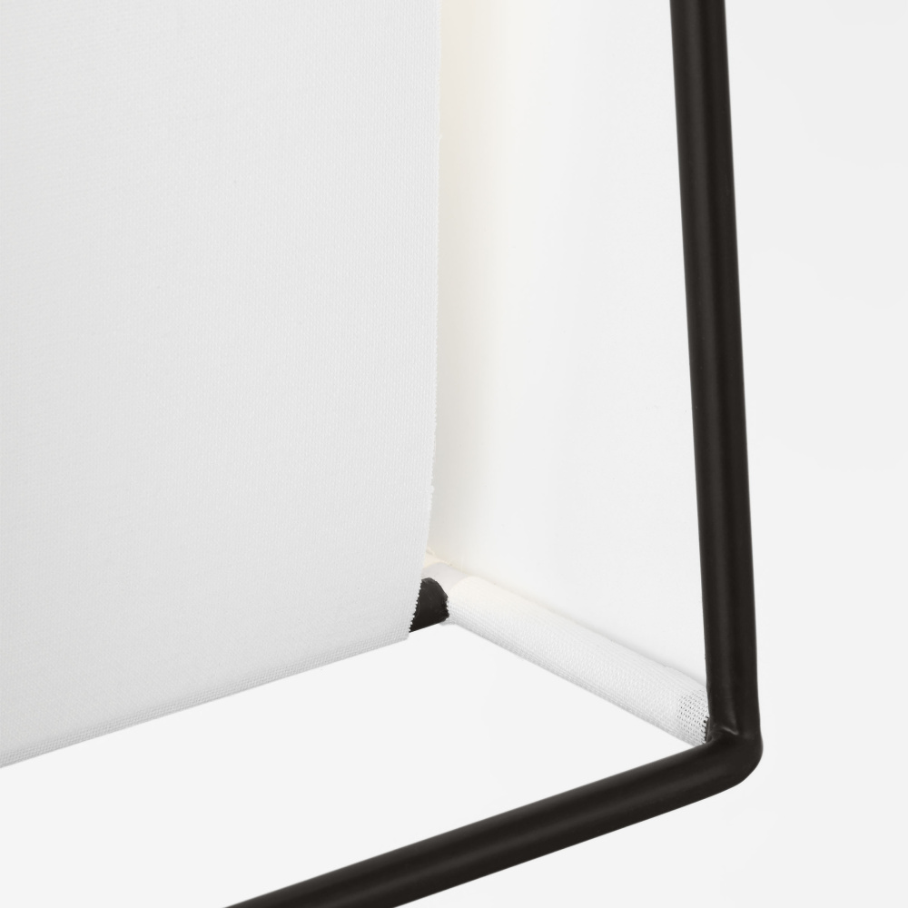 Crafted with Steel in a Aged Iron finish with white silkscreen tempered glass diffuser and white linen fabric shade