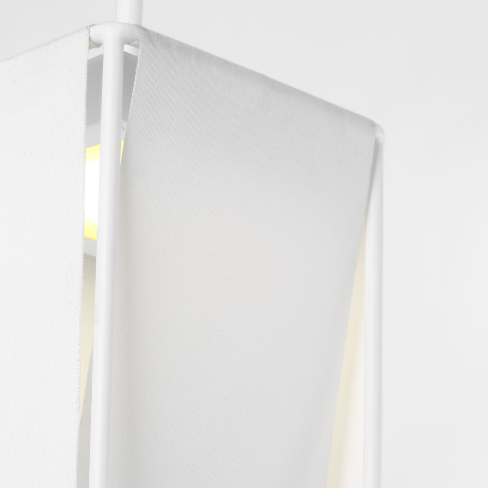 Crafted with Steel in a Soft Linen finish with white silkscreen tempered glass diffuser and white linen fabric shade