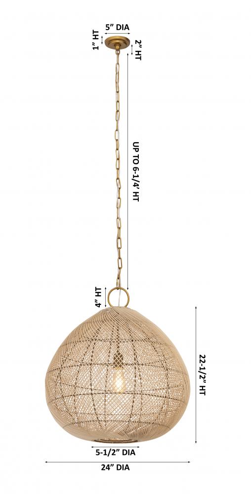 This globe-shaped pendant combines the airy texture of open weave rattan with the sleek sophistication of wire detailing. The natural rattan design adds warmth, while the wire loop and complementary chain provide a sturdy and stylish suspension. This piece
