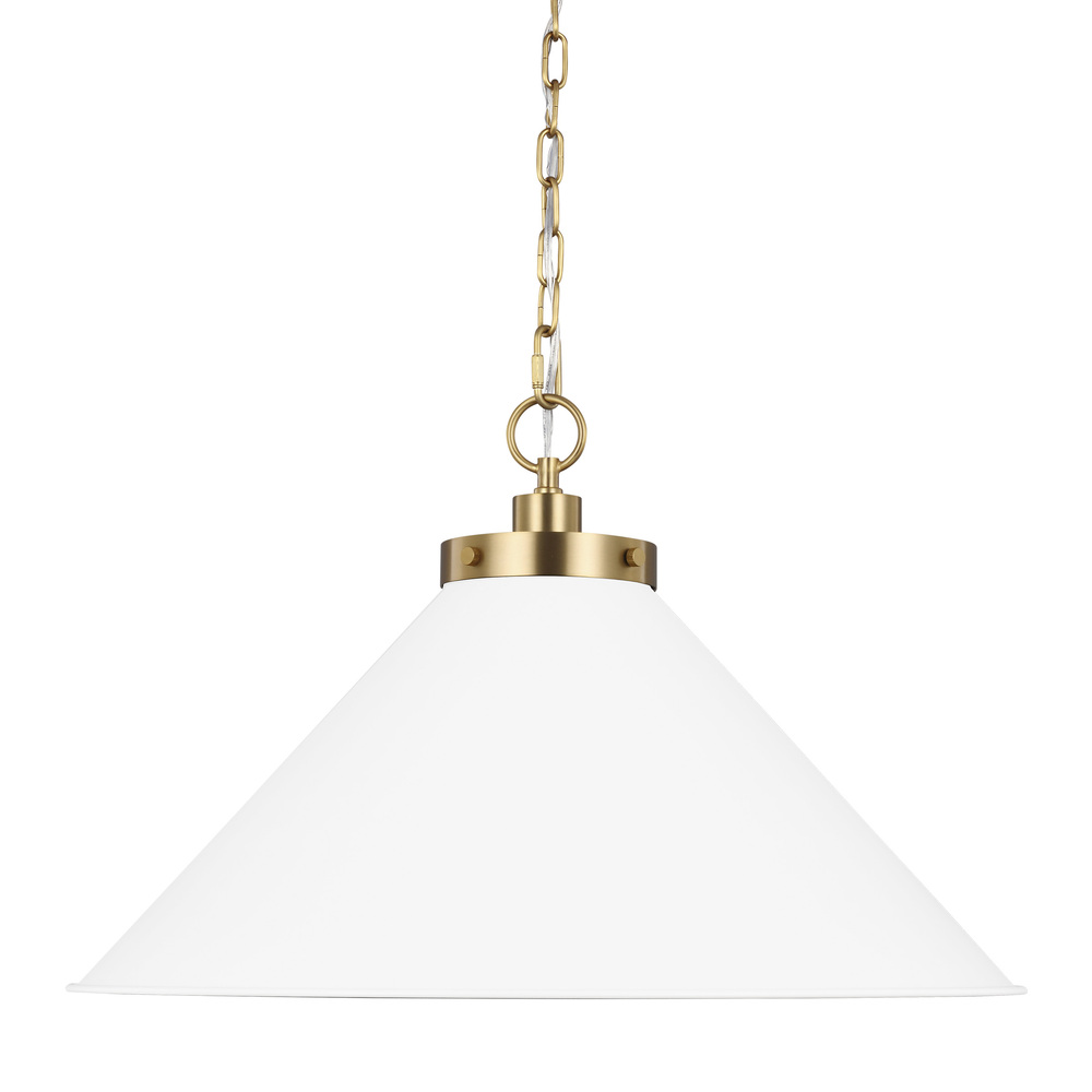 Inspired by various classic utility silhouettes - from factory lighting to barn sconces - capped by contrasting metal hardware. Each shade of the Wellfleet series by Chapman & Myers is available multiple sizes of 3 versatile profiles; either a flat farm dome, a traditional factory dome, or tapered cone. The shades are available with either a black or white finish and are paired with either a burnished brass or polished nickel collar, chain and canopy.