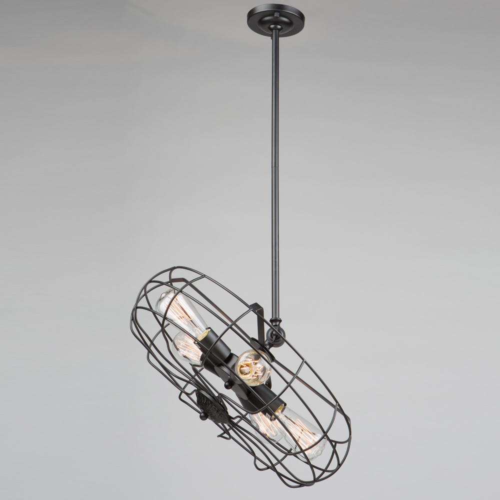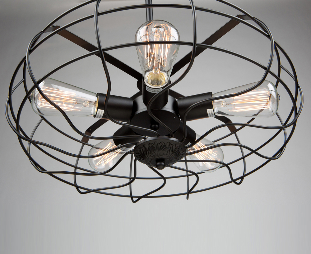 With the design of a decorative fan, the "Windswept" collection 5 light chandelier is very unique and stylish. It is finished in a matte black color. It is actually adjustable so you can direct the frame to any position. Comes with multiple rods for different heights (also included is a hang straight for sloped ceilings).